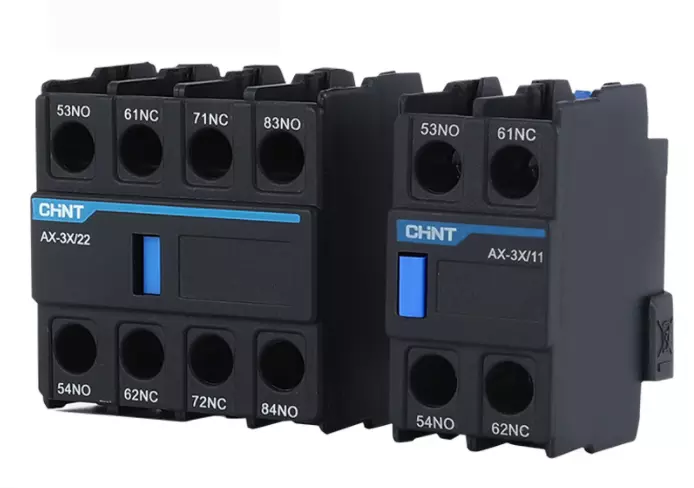 CHINT AX-3X Series Auxiliary Contact Blocks are devices that attach to the top of contactors to provide extra electrical contacts. These additional contacts are used for things like signaling when the contactor is on or off, interlocking it with other devices, or sending signals to control systems. By adding these auxiliary contacts, the contractor can do more than just switch power, and it allows for more complex and sophisticated electrical control circuits.